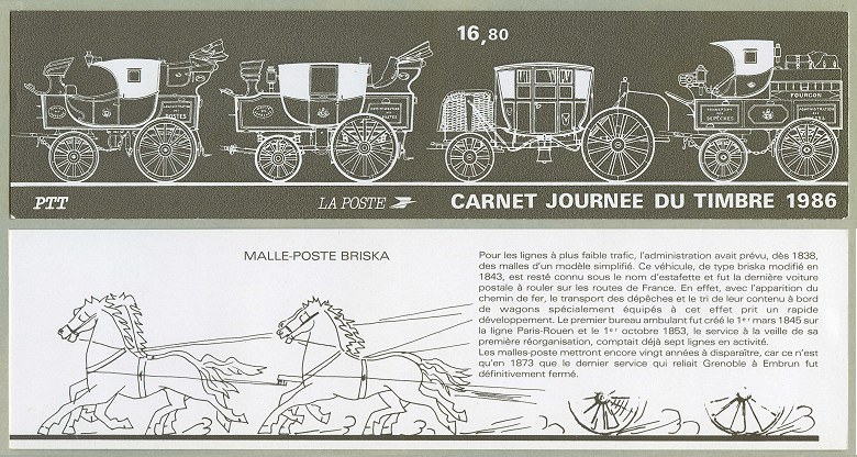 1er mars 1845 Création du premier bureau ambulant sur la ligne Paris-Rouen – Le carnet de la malle-poste Briska – Pour les lignes à plus faible trafic, l’administration avait prévu, dès 1838, des malles d’un modèle simplifié. Ce véhicule, de type briska modifié en 1843, est resté connu sous le nom d’estafette et fut la dernière voiture postale à rouler sur les routes de France. En effet, avec l’apparition du chemin de fer, le transport des dépêches et le tri de leur contenu à bord de wagons spécialement équipés à cet effet prit un rapide développement. Le premier bureau ambulant fut créé le 1er mars 1845 sur la ligne Paris-Rouen et le 1er octobre 1853, le service à la veille de sa première réorganisation, comptait déjà sept lignes en activité. Les malles-poste mettront encore vingt années à disparaître, car ce n’est qu’en 1873 que le dernier service qui reliait Grenoble à Embrun fut définitivement fermé. D’après le texte du carnet La malle-poste Briska (du russe ϐриЧЌa, prononcer britchka) était une voiture légère originaire de Russie où elle était utilisée pour les transports rapides de fonds. Le briska (de l’allemand Barutsche, du polonais bryczka, « voiture légère » ; ou du russe britchka, « chariot léger », lui aussi venant du polonais) est une calèche légère à 4 roues, d’origine autrichienne, à la caisse en osier, qui servait de véhicule de voyage à la fin du XVIIIe siècle et au XIXe siècle. On rencontre fréquemment la forme féminine, « une briska ». Vers 1840, le briska remplaça parfois la malle-poste, plus lourde. En France, sous Louis-Philippe, le service de la Poste était assuré par vingt-cinq berlines et quatre cents briskas. D’après Wikipédia source timbres phil-ouest