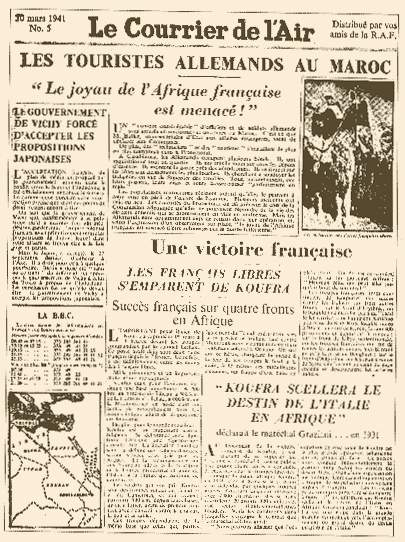 Sources des images http://fxeuzet.free.fr/blog/1941/afrique/01-03.jpg Annonce de la chute de l’oasis de Koufra dans le « courrier de l’air », journal en français distribué par la RAF en métropole timbre phil-ouest avec cette précision Remarquez les plis du képi, ils rappellent ainsi qu’après avoir vaincu les italiens à Koufra (Libye) le Général Leclerc s’était bricolé un képi à partir d’une chéchia de zouave recouverte d’une toile de couleur kaki , avec une visière taillée dans un morceau de cuir et deux étoiles couleur argent empruntées aux italiens. Dans la cavalerie (les blindés) les couleurs des galons et étoiles sont argent et http://fxeuzet.free.fr/blog/1941/afrique/01-03b.jpg Présentation du fanion de la sahariana di cufra, l’unité italienne qui défendait le fort d’El tag, au colonel Leclerc