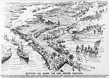 3 juillet 1898 Bataille de Santiago de Cuba – Le 3 juillet 1898, la flotte américaine affronte la flotte espagnole à la bataille de Santiago de Cuba. Les six navires espagnols, commandés par Pascual Cervera, sont coulés ou mis hors de combat par les américains. La flotte espagnole des Caraïbes, surnommée Flota de Ultramar, est détruite. L’internaute histoire La bataille de Santiago de Cuba est la plus grande bataille navale de la guerre hispano-américaine dans l’océan Atlantique. Elle oppose la flotte espagnole de l’amiral Pascual Cervera y Topete et des bâtiments de l’US Navy de l’escadre de l’Atlantique nord du vice-amiral William T. Wikipédia