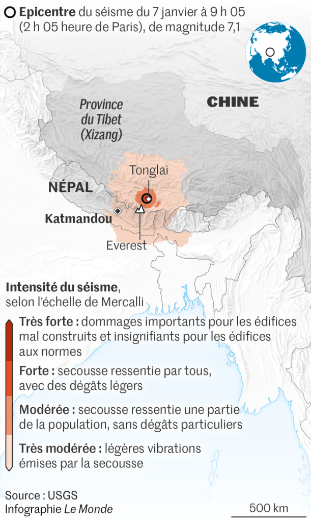 7 janvier 2025 Au Tibet, le bilan du puissant tremblement de terre monte à 126 morts – Le séisme de magnitude 6,8 a secoué le canton de Dingri, situé en haute altitude, dans la région himalayenne. Le Monde