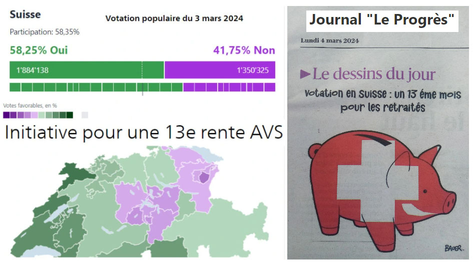3 mars 2024 Le peuple suisse s’est exprimé sur l’initiative pour une 13e rente AVS. Source Un 13e mois pour les retraités. avec photo du journal « Le progrès » avec Le dessins du jour !