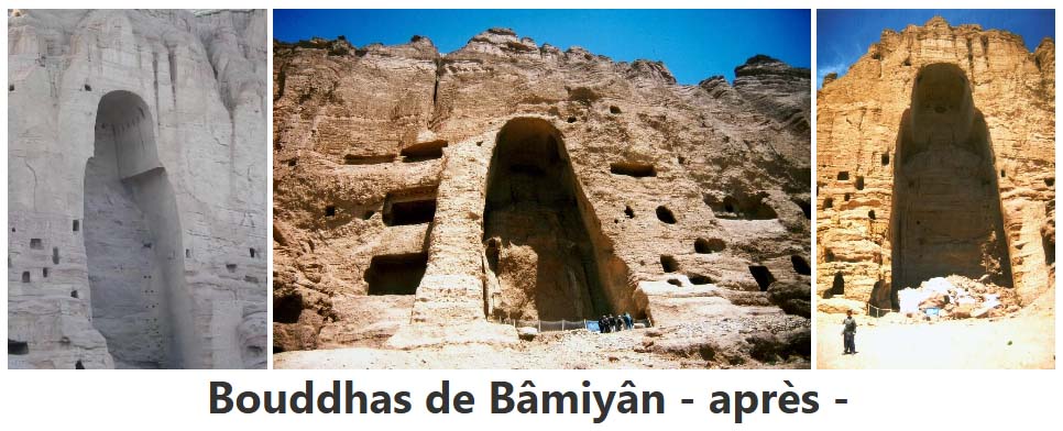3 mars 2001 Iconoclastes – Les talibans, intégristes musulmans maîtres de l’Afghanistan, procèdent au dynamitage des statues des deux plus grands bouddhas debout du monde. Hauts de 38 et 55 mètres, ils ont été sculptés dans la paroi rocheuse de la vallée de Bamyan, il y a 1.500 ou 1.600 ans par des moines bouddhistes. Ces trésors de l’humanité sont jugés idolâtres et contraires à l’Islam. Le préjudice est irréparable. l’événement sur wikipédia – décret du 26 février 2001 les statues sont décrétées idolâtres par Mohammed Omar et 11 mars 2001 les deux statues avaient disparu après presque un mois de bombardement intensif. Bouddhas de Bâmiyân lien wikipédia –