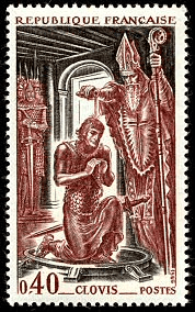 13 juin 496 Baptême de Clovis Clovis Ier, en latin Chlodovechus, seule forme contemporaine écrite attestée, peut-être en francique reconstitué Chlodowig, né vers 466 et mort à Paris le 27 novembre 511, est roi des Francs saliens, puis roi de tous les Francs de 481 à 511. Issu de la dynastie des Mérovingiens, il est le fils de Childéric Ier, roi des Francs saliens de Tournai (Belgique), et de la reine Basine de Thuringe. Brillant chef militaire, il accroît considérablement le territoire du petit royaume des Francs saliens dont il hérite à la mort de son père pour unifier une grande partie des royaumes francs, repousser Alamans et Burgondes et annexer les territoires des Wisigoths dans le Sud de la Gaule. Le règne de Clovis est connu à travers la description qu’en fit l’évêque gallo-romain Grégoire de Tours, dont l’Histoire des Francs est riche d’enseignements, bien que ce texte semble essentiellement à visée édifiante. Clovis est considéré dans l’historiographie comme un des personnages historiques les plus importants de l’histoire de France ; la tradition républicaine reconnaît en lui le premier roi de ce qui devint la France, et la tradition royale voit en lui le premier roi chrétien du royaume des Francs. Indication sur Phil-Ouest timbres – phil-ouest D’après Wikipédia – lien baptême de Clovis 24/25 décembre 496-508 –