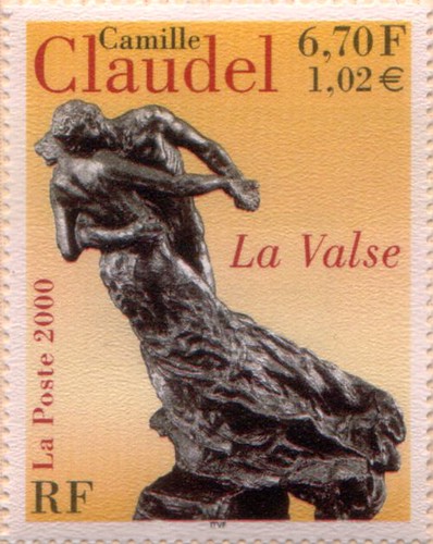 Camille Claudel est à peine sortie de l’adolescence lorsqu’elle commence à modeler de la terre et décide de sa vocation de sculpteur. À 17 ans, elle réalise un buste de son frère Paul, drapé dans un costume à l’antique. Outre les prémisses d’une étonnante dextérité technique qui ne demande qu’à s’affirmer, on peut déjà lire dans cette pièce de jeunesse certaines des composantes de l’œuvre où se conjuguent un ardent souci de réalisme et les données d’une vision romantique à la théâtralité omniprésente. Volontaire, indépendante et passionnée, la jeune artiste entraine sa famille à Paris, loue un atelier, suit des cours et reçoit les encouragements d’Alfred Boucher. En 1883, grâce à ce dernier, Camille rencontre Rodin, devient sa praticienne et son inspiratrice tandis qu’elle s’engage dans une liaison difficile qui durera une dizaine d’année. Elle sert en particulier, de modèle pour deux marbres admirables : l’Aurore et la Pensée, tandis que de son côté, elle expose un “Buste d’Auguste Rodin”, qualifié par la critique d’authentique chef-d’œuvre susceptible de rivaliser avec l’extraordinaire puissance créatrice du Maître. En 1891, l’artiste entreprend les premières ébauches de “La Valse”, cette étreinte passionnée d’un homme et d’une femme s’élançant dans un tourbillon d’étoffes drapées qui accentue encore la sensualité du sujet. Cette composition audacieuse, qui privilégie l’expressionnisme de l’enlacement amoureux et défie la notion d’équilibre, apparaît comme l’une des œuvres les plus largement autobiographiques de Camille Claudel. “La danseuse, écrivait Paul Claudel, celle qui entend la musique, c’est elle par – dessous le danseur… qui l’entraine dans un tourbillon enivré..” Partie en italique indiquée sur – danse – (sur mon autre blog) Quelques années plus tard, lors de la séparation douloureuse d’avec Rodin, l’artiste réalise : ”l’Age mûr”, où dans une mise en scène dramatique, un homme, retenu par une femme âgée, se détourne d’une jeune fille à genoux qui l’implore. Parmi les réalisations les plus importantes de l’artiste, il faut également citer “La Vague”, datée de 1898, où 3 figures féminines miniaturisées et identiques dans leur unité symbolique évoquent l’être humain face à l’immensité de la nature. À moins que la grande vague déferlante ne soit prémonitoire de cet anéantissement autodestructeur qui va ravager la vie de l’artiste et conduire à l’enfermement psychiatrique à vie celle dont une critique de l’époque a pu écrire: “Camille Claudel est sans contredit l’unique femme sculpteur sur le front de laquelle brille le signe du génie”. Maäten Bouisset. Source : Collection philatélique de la poste. Timbre : Sculpture en bronze, conservée au musée Rodin à Paris. Mis en page par Aurélie Baras, imprimé en héliogravure. Vente anticipée le 8 avril 2000 à Paris et générale le 10 du même mois.