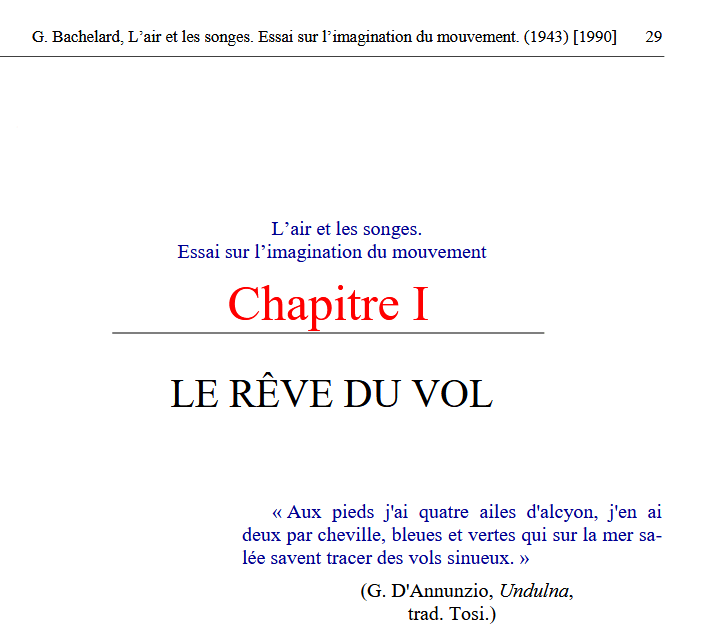 L’air et les songes. Essai sur l’imagination du mouvement. de Gaston Bachelard (1943) Le rêve du vol de la page 29 à 77 voir ici