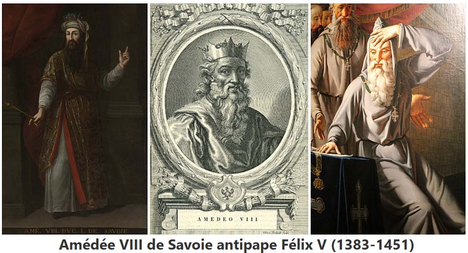 19 février 1416 Dans la cour du château de Chambéry, en présence de tous ses barons et vassaux, le roi des Romains Sigismond élève le comte de Savoie Amédée VIII (1383-1451) à la dignité de prince et duc, avec pour lui et ses héritiers les honneurs et la prééminence qui s’y attachent. Ainsi le comte de Savoie se voit-il récompensé de ses efforts pour étendre son domaine jusqu’au nord du lac Léman comme vers la vallée du Pô. Il est possible qu’il songe à ce moment à s’émanciper complètement du Saint Empire dont il fait encore partie et acquérir le titre royal. Mais au lieu de la couronne royale, il va recevoir la tiare pontificale !… hérotode.net – Wikipédia