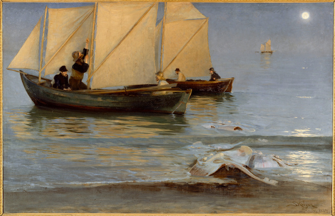 Bateaux de pêche, 1884 À partir de 1882, Kroyer passe plusieurs étés à Skagen où il représente la vie rustique des pêcheurs. C’est le retour de la pêche au crépuscule. La composition est rigoureuse, avec un premier plan fait de plusieurs lignes horizontales rompues par le mouvement des raies. Dans la moitié supérieure, la disposition des bateaux mène le regard à l’arrière-plan, jusqu’à la pleine lune, traversant un horizon imperceptible. L’association des couleurs jaune et bleue rendent la lumière particulière de l’heure bleue, moment du soir où le ciel se remplit d’un bleu foncé. – lien sur la page (avec l’illustration)