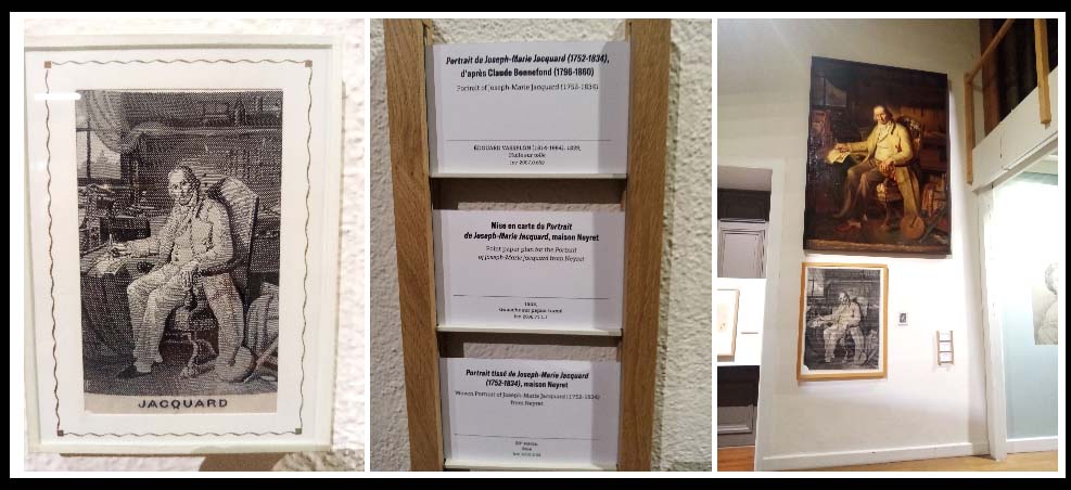 Fils de soyeux, il fait son apprentissage chez un relieur, un typographe, puis un coutelier. Il hérite d’une fabrique où il met au point sa mécanique en 1800. Le métier Jacquard sera mal reçu par les canuts qui voient en lui une cause possible de chômage. La mécanique Jacquard finira par s’imposer quelques années plus tard. En 1834, 2885 métiers Jacquard tournent à la Croix-Rousse. Il y en aura jusqu’à 20.000 à la fin du XIXème siècle. Dans la continuité de ses prédécesseurs, Jacquard est arrivé au bon moment pour combiner les améliorations et mettre au point le métier qui porte son nom. Son idée est une combinaison des aiguilles de Bouchon, des cartes de Falcon et du cylindre de Vaucanson, remplacé par un parallélépipède, le tout produisant une mécanique ajoutée au métier à tisser. Cette mécanique permet de commander individuellement les fils de chaîne, ce qui constitue une avancée majeure, puisque le réalisables devient nombre d’armures infini. Source où vous pourrez trouver Jacquard l’inventeur et Jacquard le notable
