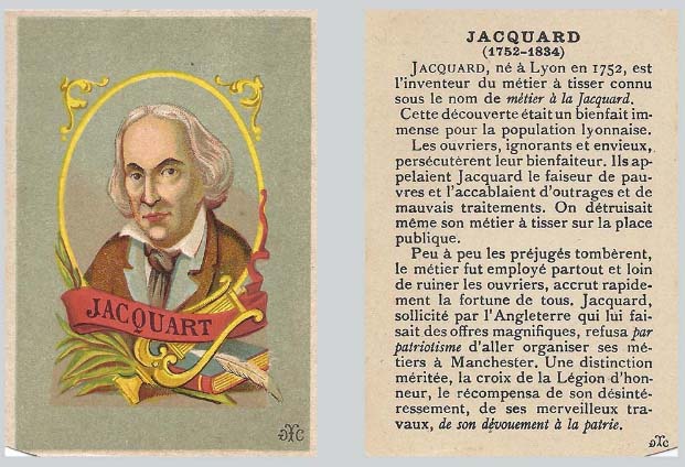 7 juillet 1752 Naissance de Joseph Marie Jacquard (1752-1834). Ce mécanicien et inventeur français mit au point, en 1807, le métier à tisser Jacquard qui porte son nom avec des fonctions automatiques. Il a équipé un métier d’un mécanisme sélectionnant les fils de chaîne à l’aide d’un programme inscrit sur des cartes perforées. – Les éphémérides d’Alcide 7 juillet 1752 Joseph-Marie Jacquard naît à Lyon le 7 juillet 1752. Après avoir exercé plusieurs professions liées au domaine de la soie et de l’imprimerie, il invente le métier à tisser programmable en 1801. Cette innovation, qui est souvent considérée comme l’un des ancêtres de l’ordinateur, lui vaut le prix des inventeurs de l’Académie de Lyon en 1805. Il est également fait chevalier de la Légion d’honneur en 1819. Il meurt le 7 août 1834. L’Internaute histoire lien Wikipédia