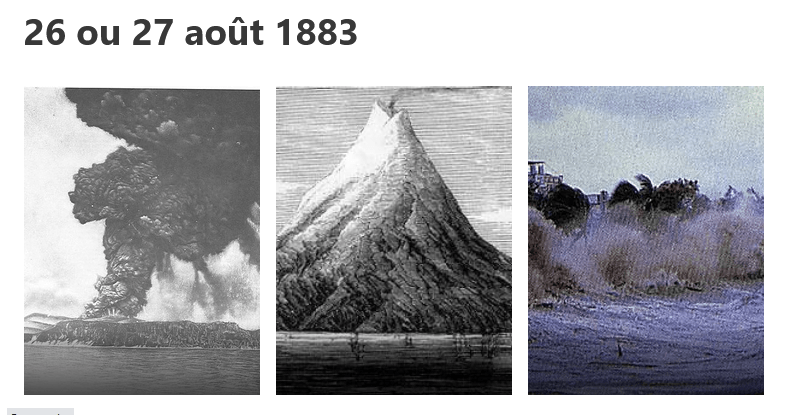 27 août 1883 Les deux tsunamis les plus catastrophiques de l’Histoire furent déclenchés par l’éruption d’un volcan insulaire de type explosif : Santorin vers 1470 avant JC et Krakatoa en 1883. Dans ces deux cas, la formation de plusieurs tsunamis successifs fut lié à une éruption plinienne suivie de la formation d’une caldeira qui abaissa le plancher océanique de plusieurs centaines de mètres. État des lieux sur la prévision et la prévention des tsunamis source UVED – Analyse et gestion des risques 27 août et 26 août selon les sources 1883 Explosion volcanique du Krakatau L’explosion du volcan Krakatoa (ou Krakatau, « mont silencieux »), situé entre les îles indonésiennes de Java et de Sumatra, est entendue jusqu’à 5 000 kilomètres. Avec celle de Santorin dans l’Antiquité, c’est l’une des plus grandes explosions volcaniques de l’histoire. Le volcan est complètement volatilisé, les poussières se retrouvent satellisées à plus de 70 kilomètres dans l’atmosphère, tandis que l’effondrement du cratère entraîne un gigantesque raz-de-marée provoquant la mort de 36 000 personnes. (27 août L’Internaute histoire) lien sur mon blog au 26 août