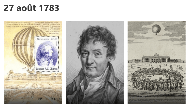 Le 27 août 1783, le physicien Jacques Charles lâcha aux vents le premier ballon à gaz rempli d’hydrogène, à Paris, devant l’École militaire. Le ballon atterrit à Gonesse, après un parcours de vingt-cinq kilomètres. Charles avait fait construire ce ballon par les frères Robert. Constitué d’une étoffe de soie imperméabilisée par un vernis à base de caoutchouc, le ballon mesurait quatre mètres de diamètre et contenait trente-trois mètres cube d’hydrogène. Quatre jours avaient été nécessaires pour gonfler le ballon. Source – Voir aussi Today in Science et Lien sur mon blog au 23 août 1783 (remplissage du ballon)