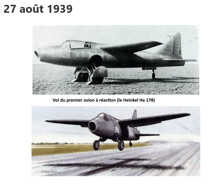 27 août 1939 Le He 178 effectue le premier vol au monde d’un avion propulsé par un turboréacteur. En Allemagne, von Ohain avait déposé un brevet en 1935 puis, pour le compte de Heinkel, réalisé le moteur He S-3 A qui développait 450 décanewtons. Il permet, dans sa version He S-3 B, de réaliser ce vol. Les éphémérides d’Universalis – archives – Le gouvernement nazi ayant refusé de croire, à travers ce projet, au potentiel du moteur à réaction. L’avion était équipé d’un train d’atterrissage rétractable d’un type classique (deux roues au centre de l’appareil plus une roulette de queue). Les militaires ne furent pas plus attirés par un tel avion, dans un premier temps. Le développement de ce type de moteur fut lent, essentiellement du fait du manque de moyens financiers, et l’avion ne fut jamais construit en série. Le premier avion à réaction allemand construit en série, le Messerschmitt Me262 Schwalbe, ne fut efficace qu’au milieu de l’année 1944, trop tard pour infléchir le cours de la Seconde Guerre mondiale. Les éphémérides d’Alcide