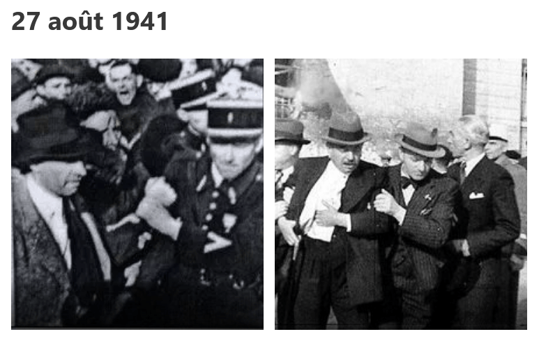 27 août 1941 La guerre au jour le jour – À Versailles, alors qu’ils passent en revue des volontaires de la légion des volontaires français (LVF) dans la cours de la caserne Borgnis-Desbordes, Pierre Laval et Marcel Déat sont victimes d’un attentat de la part de Paul Collette. illustrations : arrestation de Paul Collette, au front ensanglanté sur la photo et évacuation de Pierre Laval, blessé, à l’hôpital. 27 août 1941 Attentat à Versailles contre Laval et Déat venus saluer le premier Contingent de Volontaires Français contre le Bolchévisme. Source