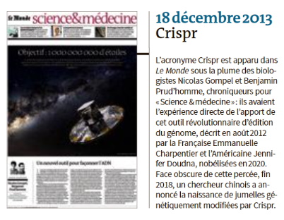 18 décembre 2013 Parution de l’acronyme Crispr dans Le supplément du journal Le Monde. Source Le Monde science et médecine numéro spécial 10 ans daté du 29 septembre 2021