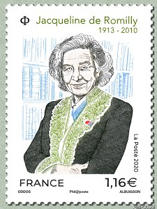 «Professeur dans l’âme» : c’est ainsi que l’illustre helléniste, fille et petite-fille de professeur, aimait à se définir. Née en mars 1913, Jacqueline David – future Jacqueline de Romilly – n’a pas connu son père, brillant normalien, philosophe, mort au champ d’honneur en octobre 1914, mais sous l’égide de sa mère, elle a marché sur ses traces. Première lauréate féminine du concours général, elle obtient en 1930 le premier prix de version latine et le deuxième prix de version grecque. C’est le premier titre de gloire de cette pionnière qui, dès lors, ne cessera plus de briller dans le domaine des lettres classiques. Normalienne, agrégée de lettres classiques, professeur de langue et littérature grecques à l’université de Lille puis à la Sorbonne, elle est en 1973 la première femme élue au Collège de France, bientôt la première femme élue à l’Académie des Inscriptions et Belles-Lettres (1975) et la deuxième femme élue à l’Académie française (1988), après Marguerite Yourcenar, mais «la première à y siéger vraiment». Éminente spécialiste de Thucydide, l’historien de la guerre du Péloponnèse qui opposa Athènes à Sparte de 431 à 404 avant J.-C., elle en renouvelle l’interprétation dans sa thèse, Thucydide et l’impérialisme athénien, puis consacre vingt ans à traduire et éditer les huit livres de son œuvre (1953-1972). Si Thucydide est «l’homme de sa vie», elle écrit aussi sur Homère, Hérodote, Eschyle, Euripide, Platon et jusqu’à Plutarque, faisant revivre la Grèce antique et son inépuisable confiance dans la grandeur de l’homme. Les Grecs, reconnaissants, lui confèrent la nationalité grecque (1995) et la nomment en 2000 ambassadrice de l’hellénisme. Quand la transmission de ce précieux héritage lui semble menacée, elle écrit L’enseignement en détresse, puis fonde l’association SEL pour la Sauvegarde des enseignements littéraires (1992) et milite vaillamment malgré la cécité qui la frappe, continuant à publier essais, manifestes, romans et nouvelles où l’on découvre le charme, l’humour et la gaieté de cette grande dame, sa générosité et son courage aussi. Une leçon de vie… source timbres phil-ouest