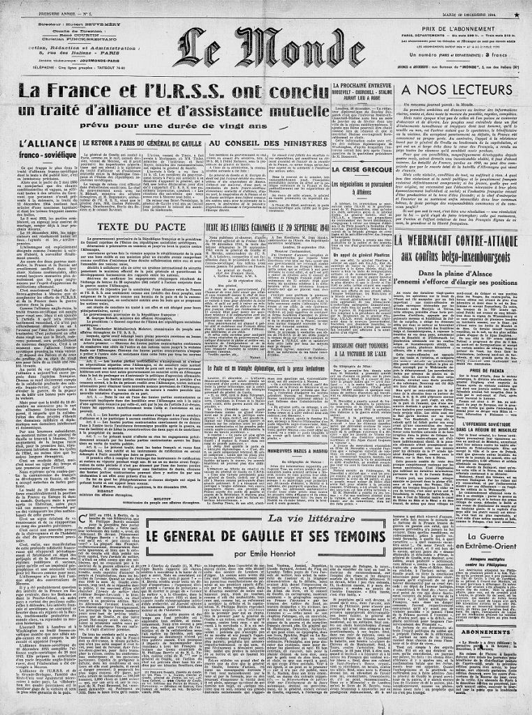 18 décembre 1944 Le journal Le Monde est fondé par Hubert Beuve-Méry (1944) source calendrier Lettres le livre scolaire 2022 – calendrier Lettres – le livre scolaire 2023 – calendrier lettres – le livre scolaire 2024 – 18 décembre 1944 Publication du premier numéro du journal Le Monde (1944) – calendrier lettres – le livre scolaire 2025